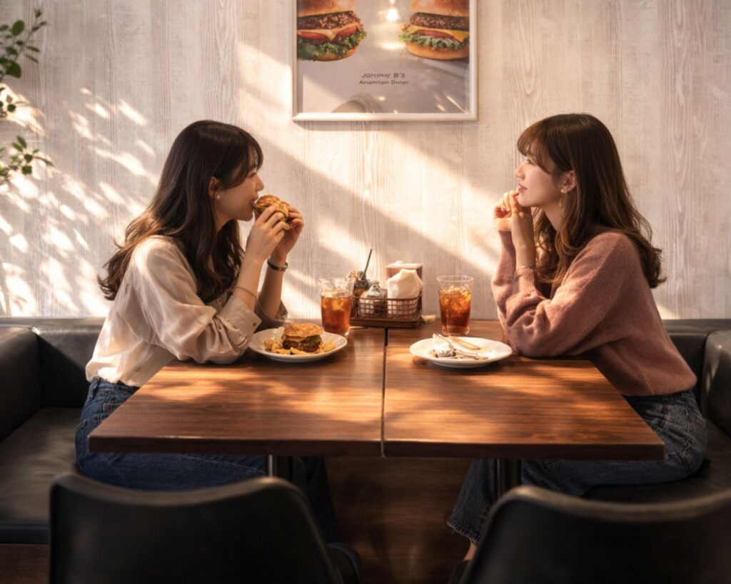 友達と放課後にバーガーを食べたり、部活帰りに少し休憩したり。そんな時間にちょうどいい、シンプルなバーガーセットです。
