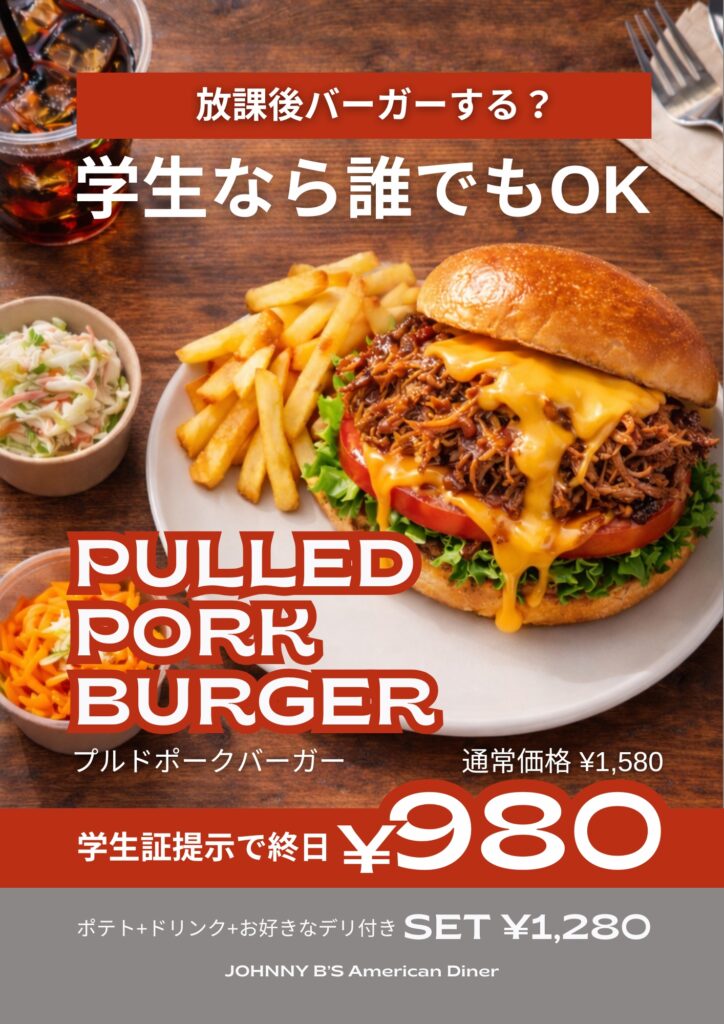学校帰りに、ちょっと寄り道。Johnny B’sでは、学生向けの特別セット「After School Burger」をご用意しています。バーガー、ポテト、ドリンク、デリ付きで学生限定 ¥1,280